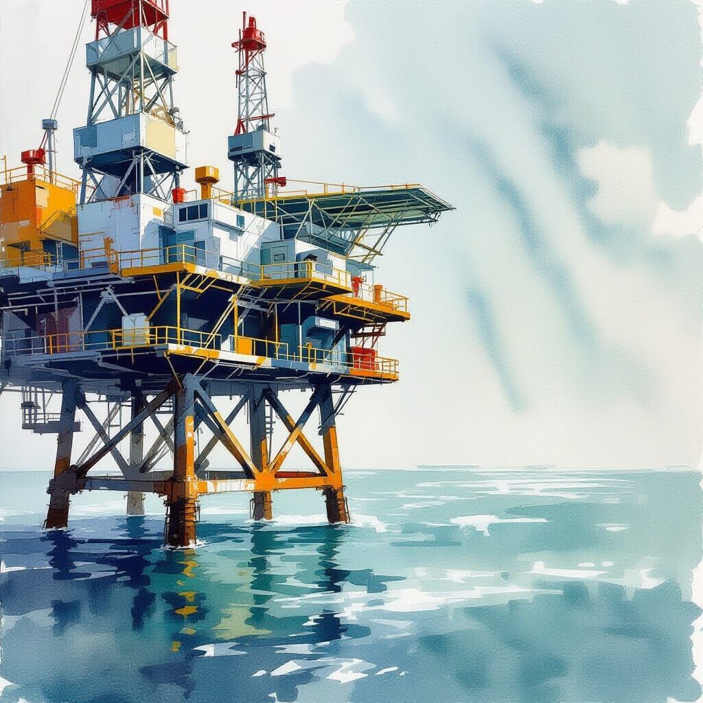 This image shows a watercolor painting of an offshore oil rig. It features stark geometric metal patterns against a soft, blurred seascape with expressive brushwork and a focus on light and atmosphere.