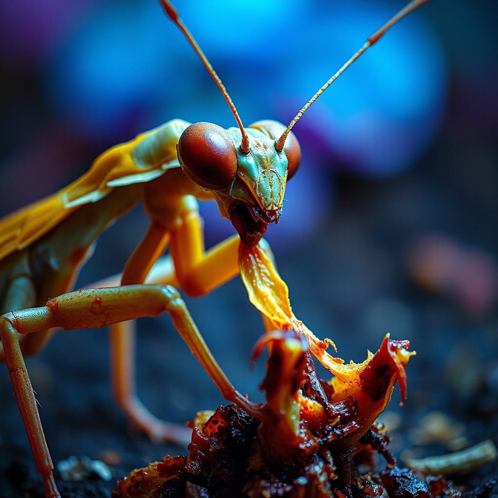 A striking picture of a praying mantis devouring its prey. The image boasts intricate details, dramatic lighting, and a vibrant, colorful background in a concept art style.