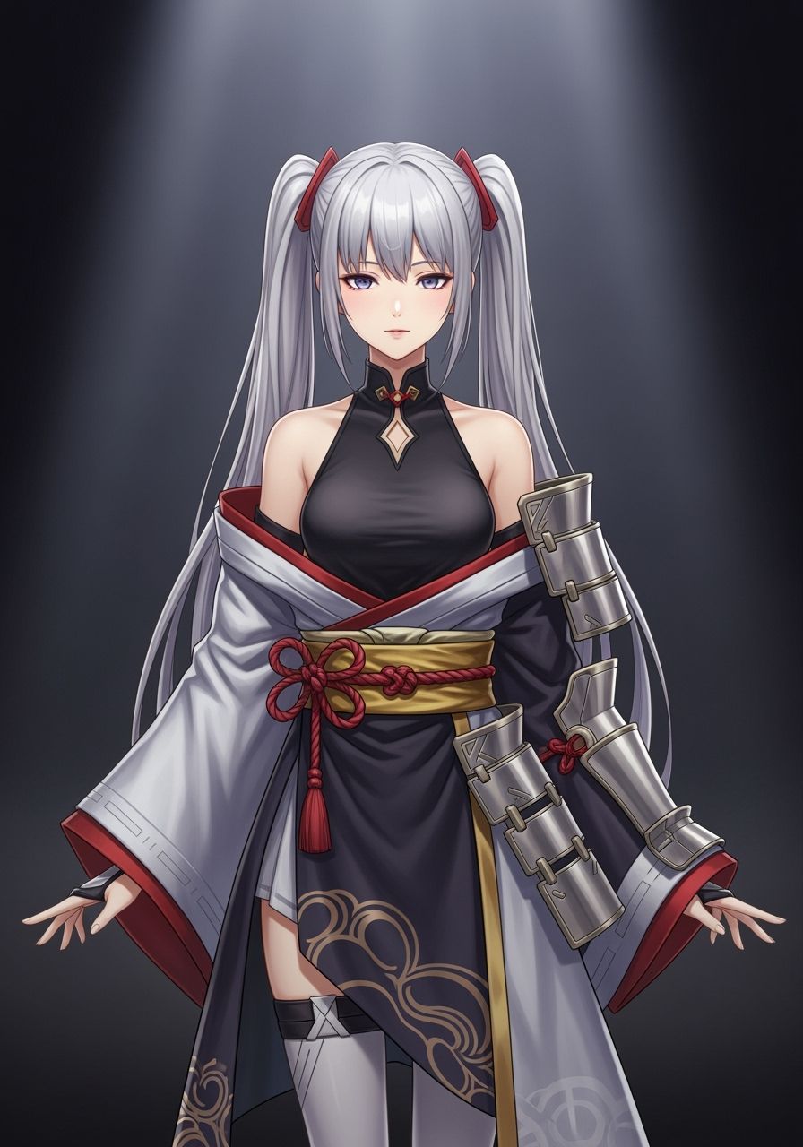 This image shows a slender, pale woman in Japanese-inspired sci-fi clothing. She has silver-white twin tails and stands in cinematic lighting, rendered in a cel-shaded anime style.