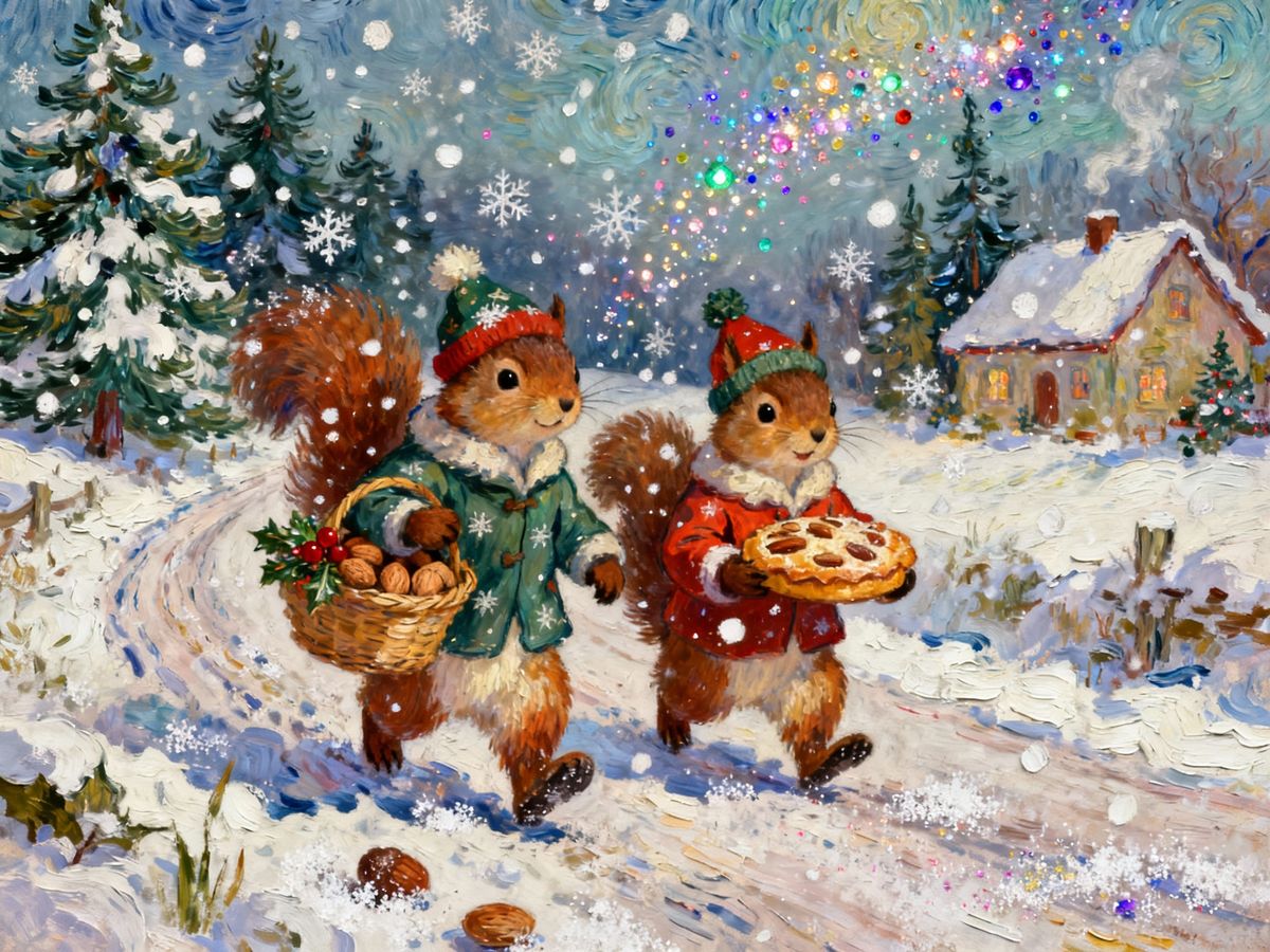 This gouache painting captures two squirrels in winter coats walking down a country road amid heavy snowfall. Features thick paint strokes and a sparkling, magical atmosphere.