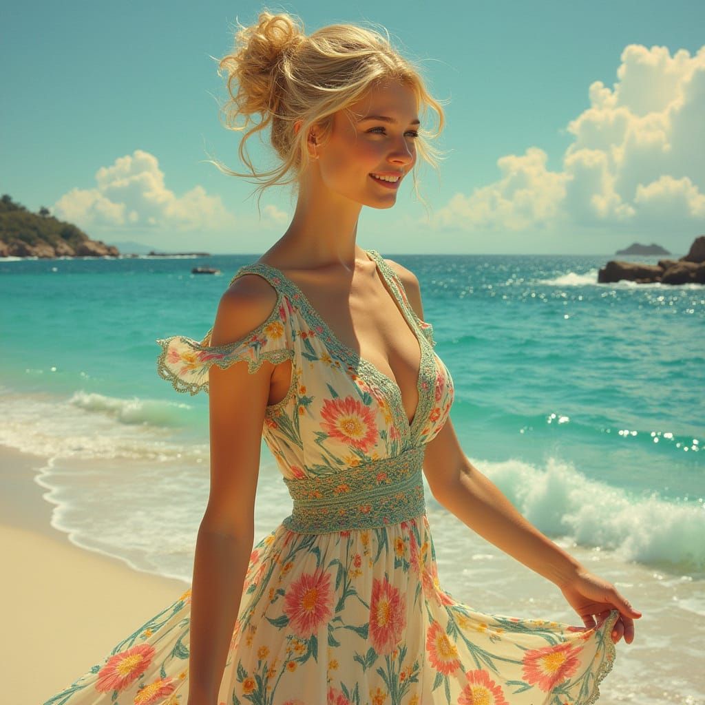 A beautiful European woman with blonde hair smiles while walking along the ocean in a floral dress. The image has an art nouveau aesthetic with delicate details and a serene atmosphere.