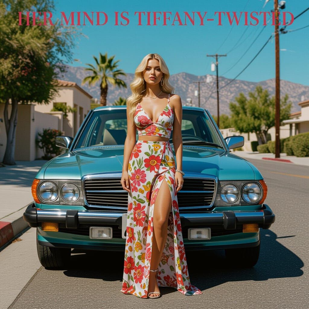 This image shows a surreal portrait of a woman surrounded by luxury items. It has a psychedelic aesthetic.