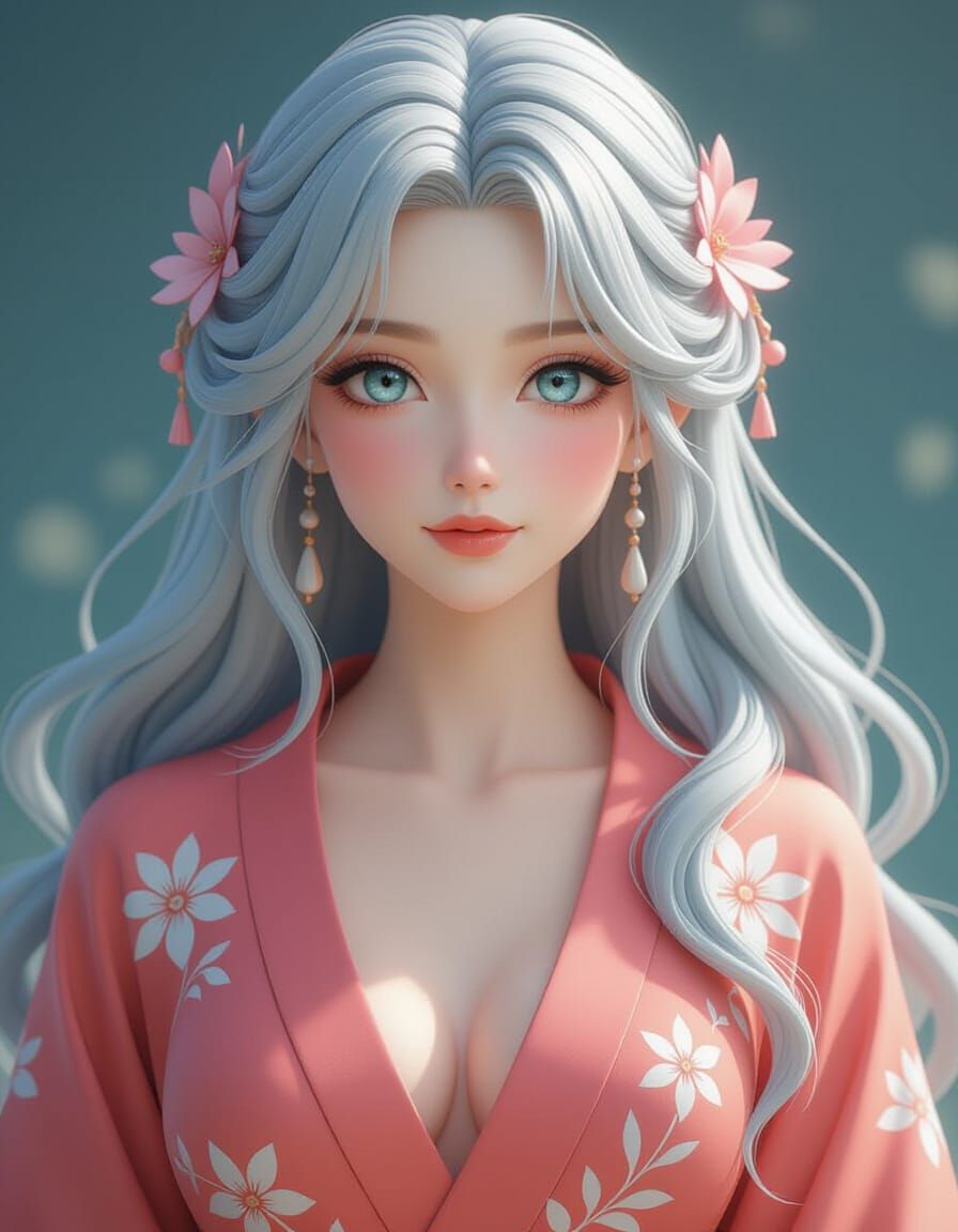 This image features a beautiful fairy-like woman with platinum and seafoam green hair, porcelain skin, and icy blue eyes. Rendered as 3D anime art, it boasts ultrafine detail and intricate lighting.