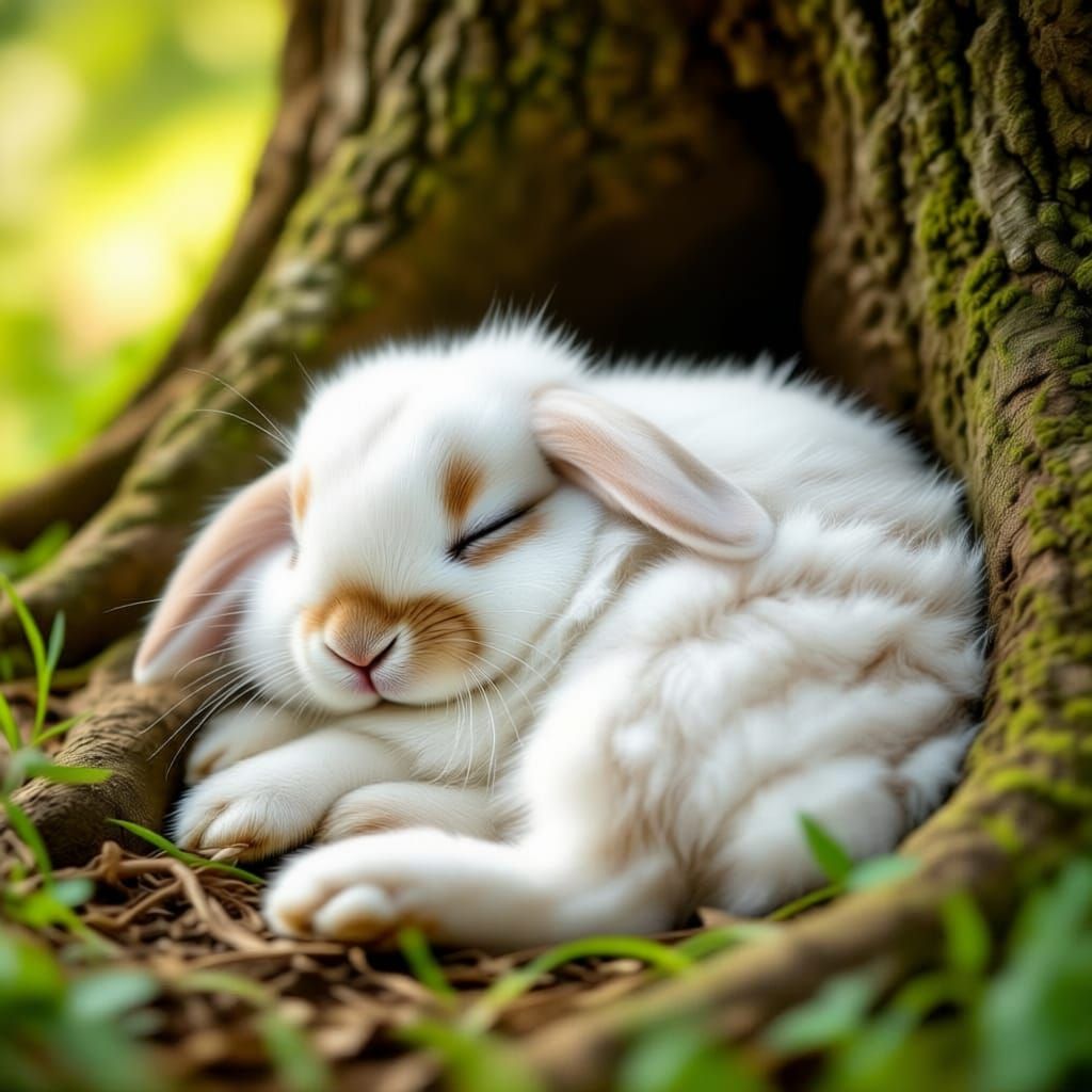This image shows a soft, fluffy rabbit peacefully asleep and curled up beneath a tree. Only its two ears are visible, adding a touch of charm.