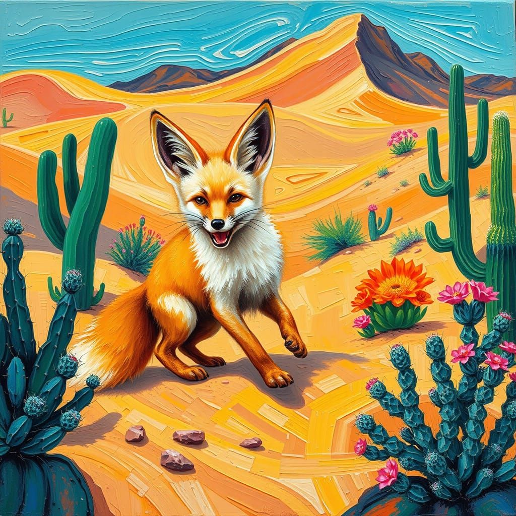 A vibrant desert scene of a playful fennec fox amidst swirling sand dunes, cacti, and colourful flora, painted in a neo-impressionist style with thick, textured brushstrokes