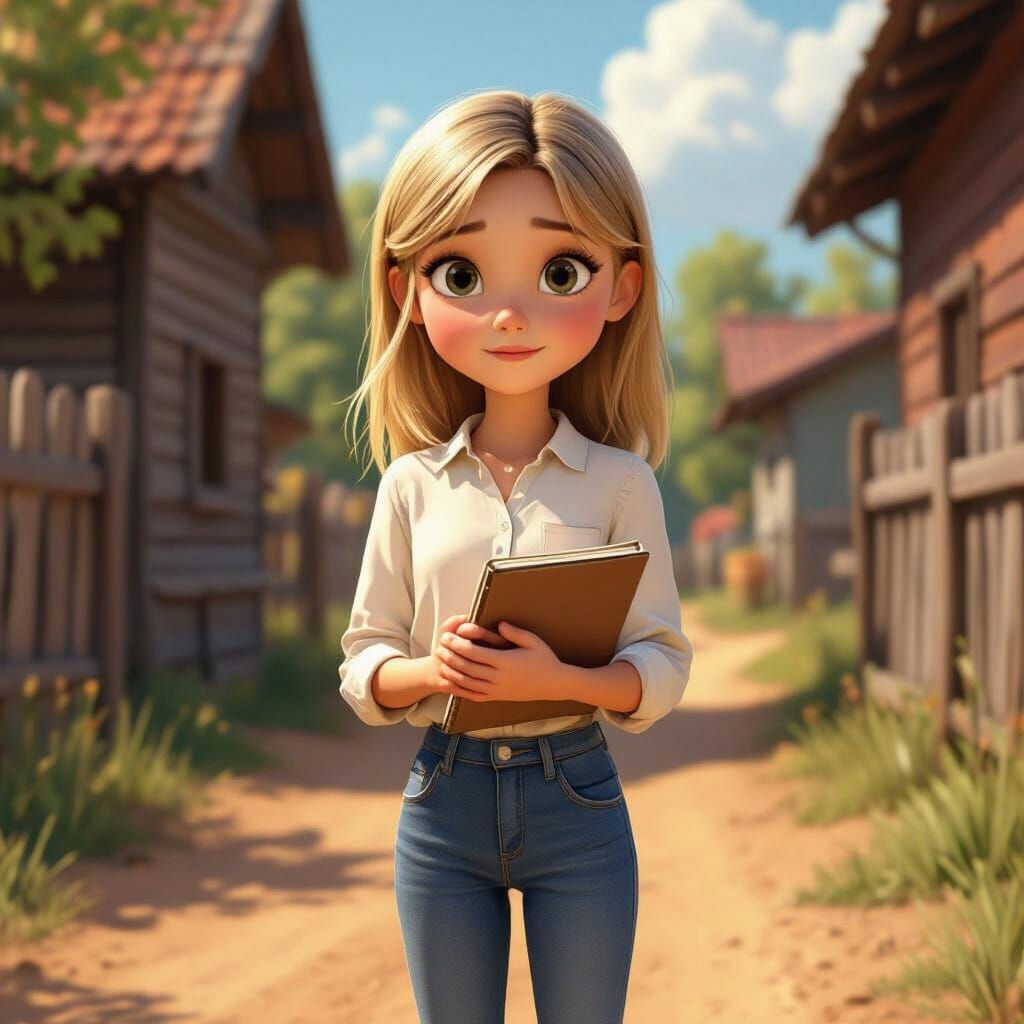 This image shows a young girl with fair skin and blonde hair in a rural setting. She is holding a notebook with a serious expression, rendered in a Pixar-inspired 3D style with vibrant lighting.