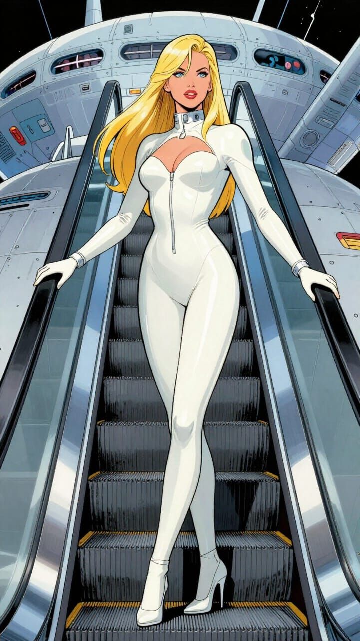 A striking illustration of Emma Frost in a sleek, white rubber space suit with high heels, boarding a spaceship. Rendered in a Franco-Belgian ligne claire style with bold outlines and flat colors.