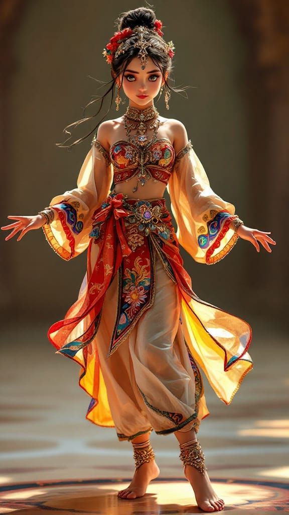 This image shows a young girl in a vibrant, detailed Middle Eastern dance costume. She is barefoot on tiptoes, adorned with ornate anklets. The artwork is rendered in a 3D anime style with exceptional detail.