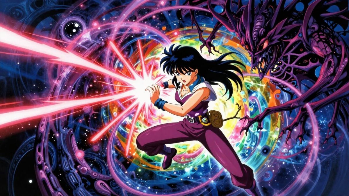 An anime-style scene of Lina Inverse, mid-incantation, channeling a powerful dragon strike towards an encroaching eldritch entity. The background is a prismatic swirl of cosmic phenomena, with impossible geometries and maddening patterns. The colors are vibrant yet unsettling, reflecting the sheer power ...