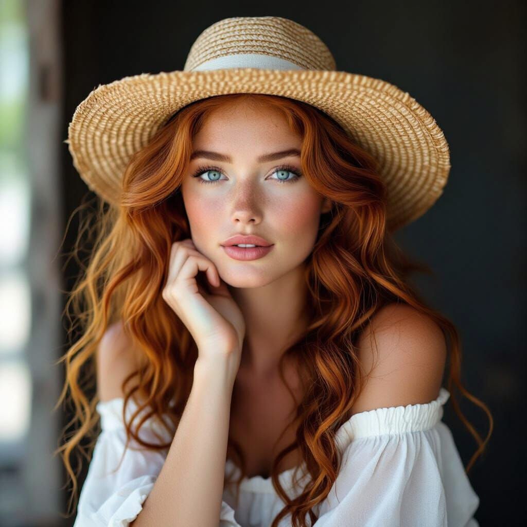 A close-up portrait of a young woman with long red hair and blue eyes, wearing a straw hat and white top. The image evokes film-like documentary photography.