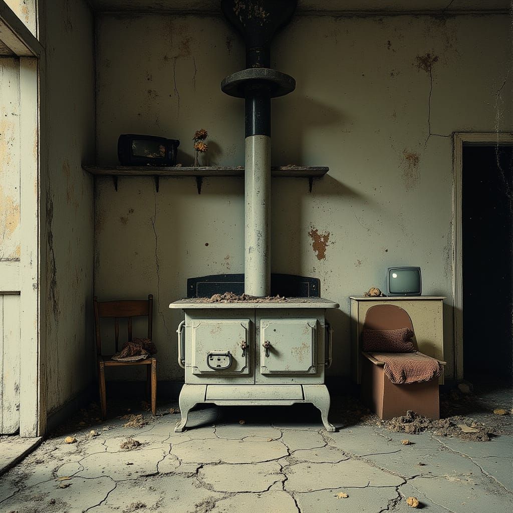 This image depicts a decaying room centered around a light gray cast iron wood stove. Worn furniture, cracked floors, and peeling walls convey an atmosphere of neglect and abandonment with dramatic lighting.