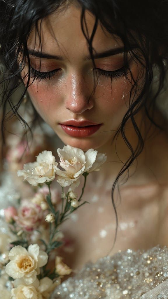 A close-up oil painting of a beautiful, ethereal princess with tearful eyes and glittering tears, wearing a sparkly sequined wedding dress.