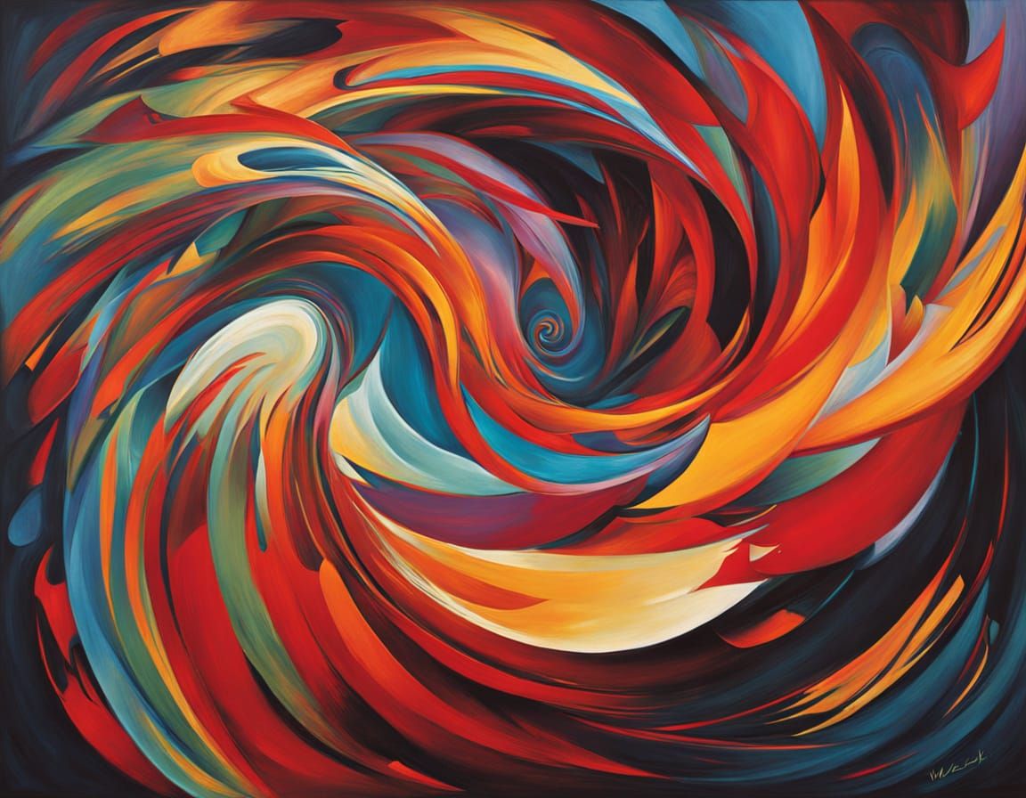 This abstract artwork features a redhead figure embodying a fox, presented as dynamic, spiraling energy. It showcases bold brushstrokes and dramatic chiaroscuro lighting.