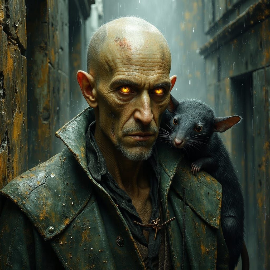 This image shows a grotesque old man with reptilian eyes and sores, accompanied by a rat in a dingy alley illuminated by moonlight. The artwork is rendered in a dark oil paint style.