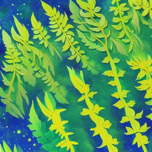 A vibrant gouache and watercolor painting of a fern flower radiating gold and emerald light. The maximalist composition features thick brushstrokes and impasto textures, creating a cosmic, dreamlike vision.