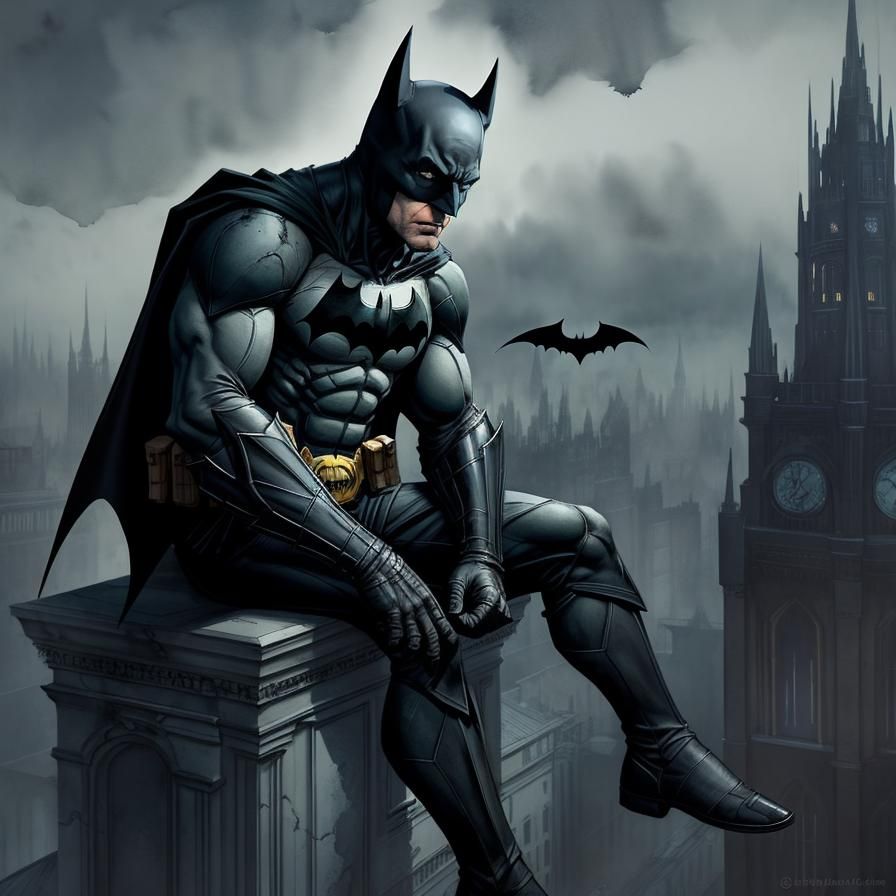 A watercolor image of Batman perched atop a gothic building. Gargoyles flank him in this dark, dystopian scene with a mysterious, dark academia aesthetic.