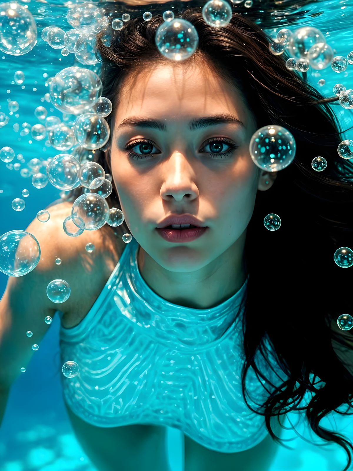 This image shows a serene young woman floating underwater, surrounded by shimmering iridescent bubbles and illuminated by soft, glowing lights. Her delicate features and dark hair blend with the dreamy atmosphere in a cinematic, photorealistic scene.