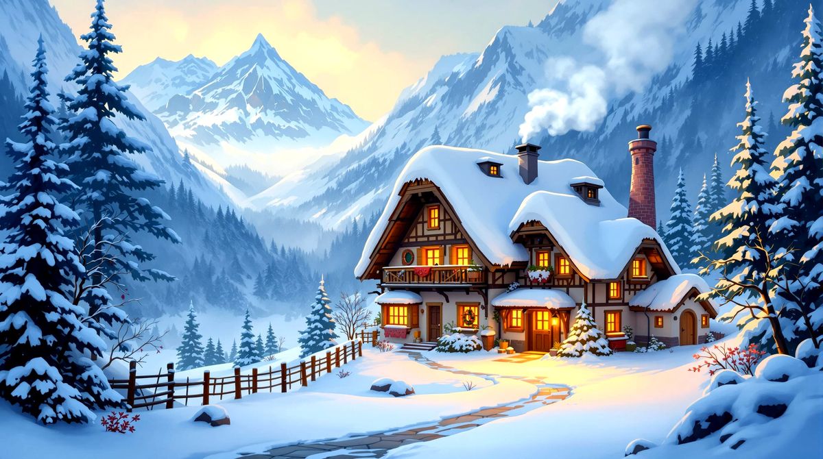 This image depicts a charming, snow-covered chalet in a whimsical Swiss Alps valley. Gentle snowfall and warm light create a peaceful, inviting scene with detailed brushstrokes.