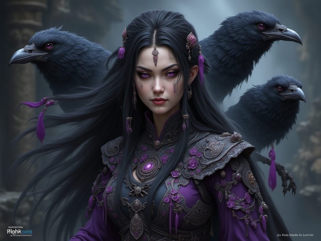 This image shows a raven priestess with long black hair, purple eyes, and a sleepy expression. She wears ornate Chinese-style robes in black and purple, accented with raven details and feathers. The atmosphere is dark and gothic with moody lighting.