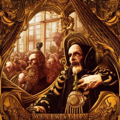 This image shows a dystopian scene depicting impoverished people. The artwork is meticulously detailed and uses deep, rich colors to create a dramatic and atmospheric warning about societal inequality.