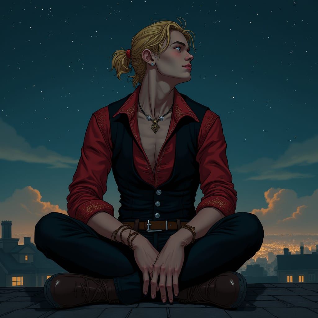 This image captures a contemplative young man sitting on a rooftop, lost in thought as he gazes up at the starry night sky. Richly embroidered Victorian attire and bold, expressive lines evoke a sense of romanticism and mystery.