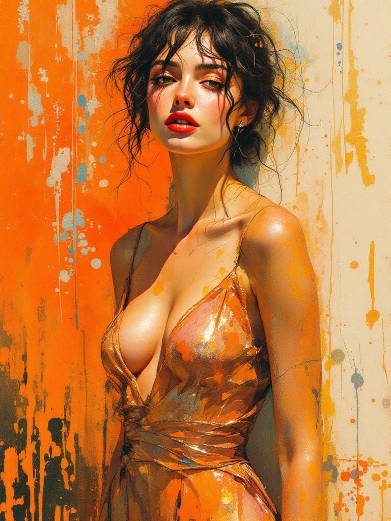 A portrait of a confident woman in tangerine swimwear making direct eye contact. This image combines watercolor techniques with energetic linework to create a luminous and expressive aesthetic.