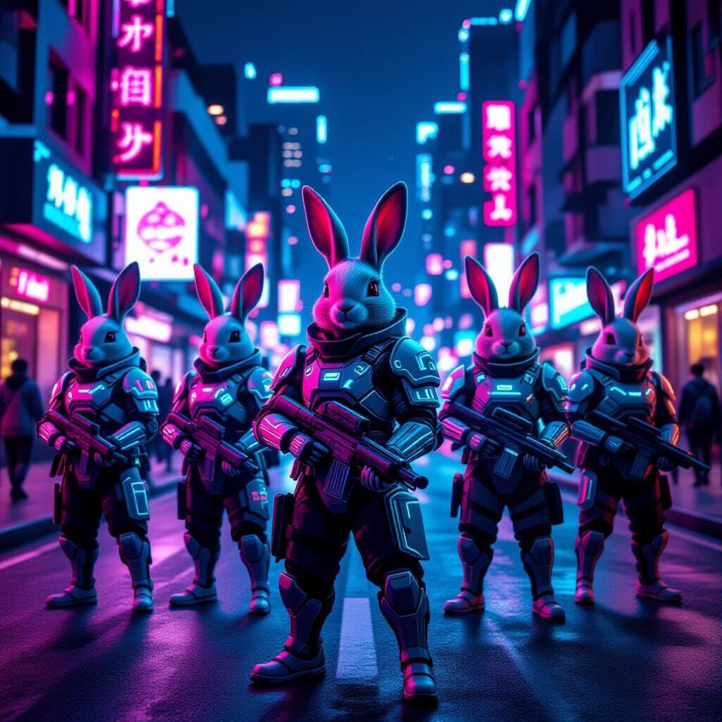This image depicts a neon-drenched city street scene featuring a group of rabbits clad in futuristic armor, wielding advanced cybernetic weaponry.