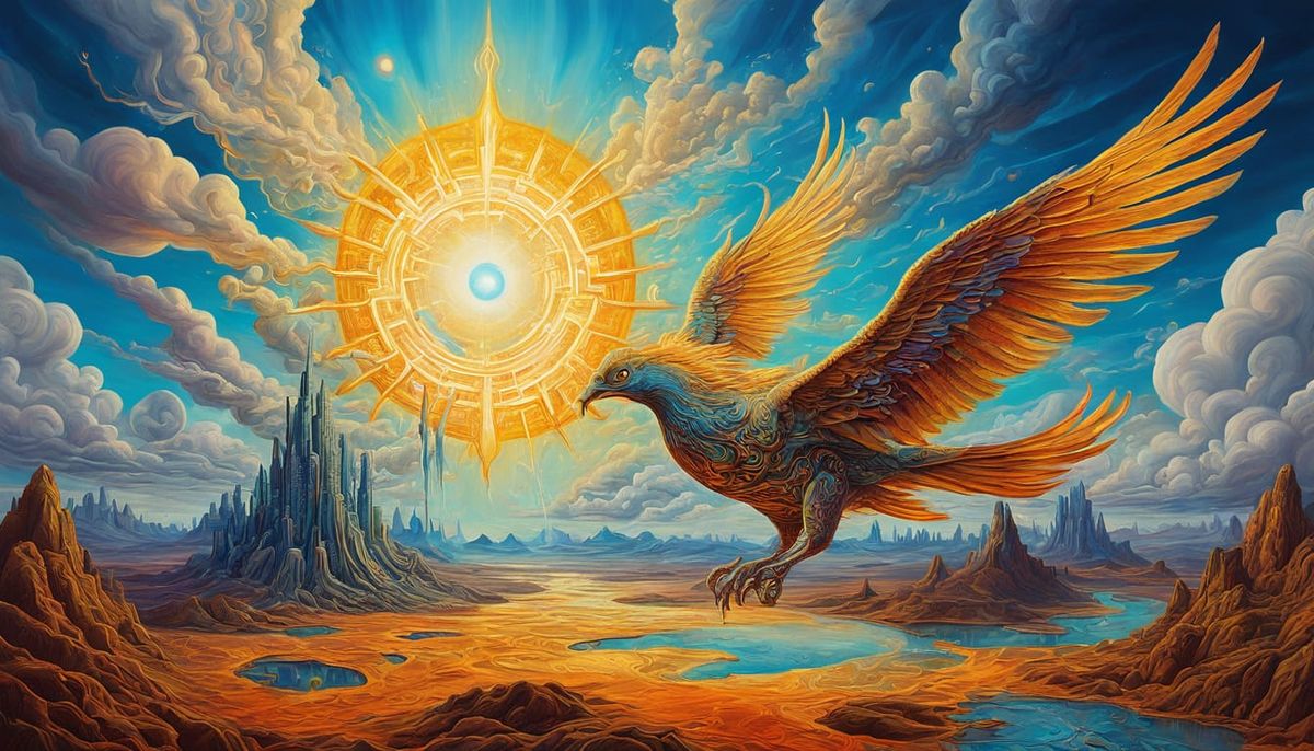 This image shows a phoenix soaring over a surreal landscape where nature and technology combine. The vibrant digital painting features crystalline trees, liquid metal, and cosmic patterns in a futuristic, ethereal style.