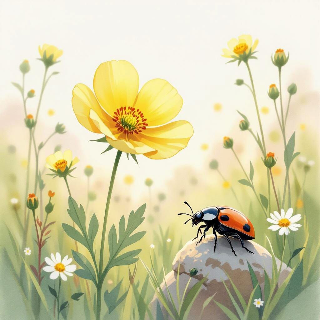 Watercolor painting. Medium shot. A buttercup and beetle share a quiet moment in a sun-drenched meadow. Soft, diffused lighting enhances the delicate details of the scene. Watercolor on paper, soft pastel colors, gentle brushstrokes, intricate details, a masterpiece, best quality, trending on Deviantart, ...