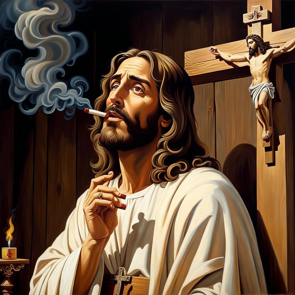 This image shows a comedic painting of Jesus Christ smoking a cigarette, set against a backdrop with a crucifix. The artwork employs dramatic cinematic and volumetric lighting for a detailed composition.