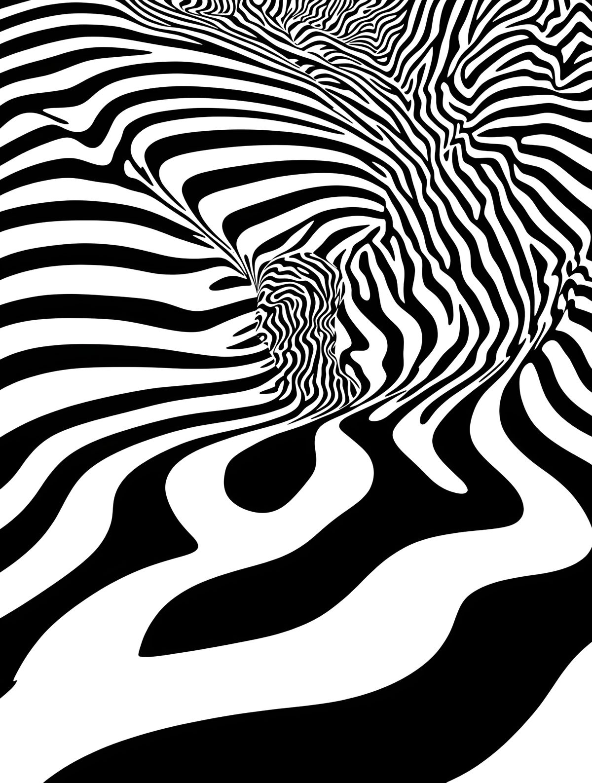This high-contrast op-art image subtly reveals a female silhouette through flowing, distorted curved lines. The composition creates a wave-like pattern with rhythmic undulation, showcasing a ghosted figure.