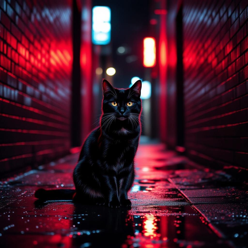 This image shows a street cat or dog in a nighttime urban alley, illuminated by red and black neon reflecting off wet pavement. The picture has an edgy and gritty fashion-forward aesthetic.