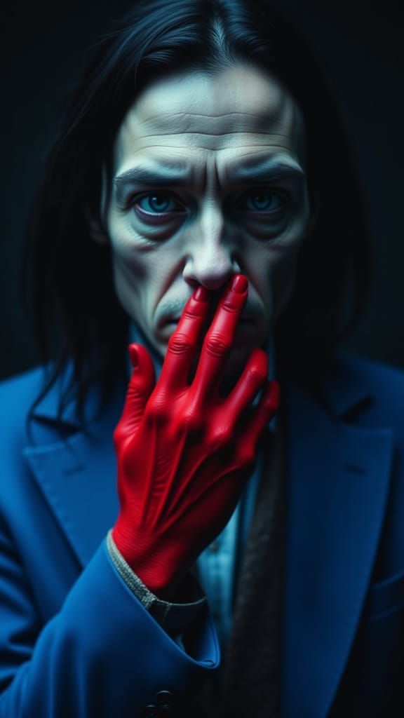 This image shows a figure in a blue suit with striking cold blue eyes and a prominent crimson red hand. It features neo-noir photography style with dramatic lighting and stark shadows.