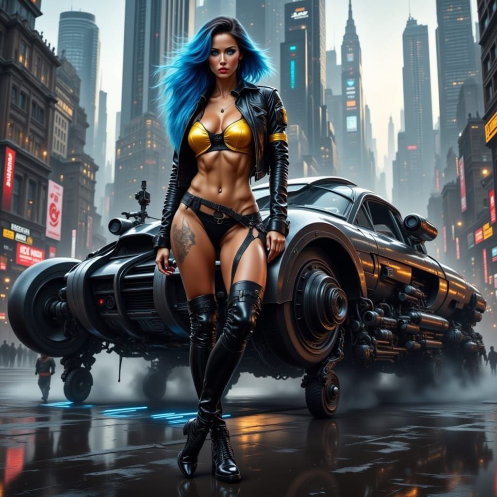 A striking picture of a muscular cyborg woman with blue hair in a skintight bodysuit, leaning against her hovercraft in a dystopian city. The image is rendered in a photorealistic cyberpunk aesthetic.