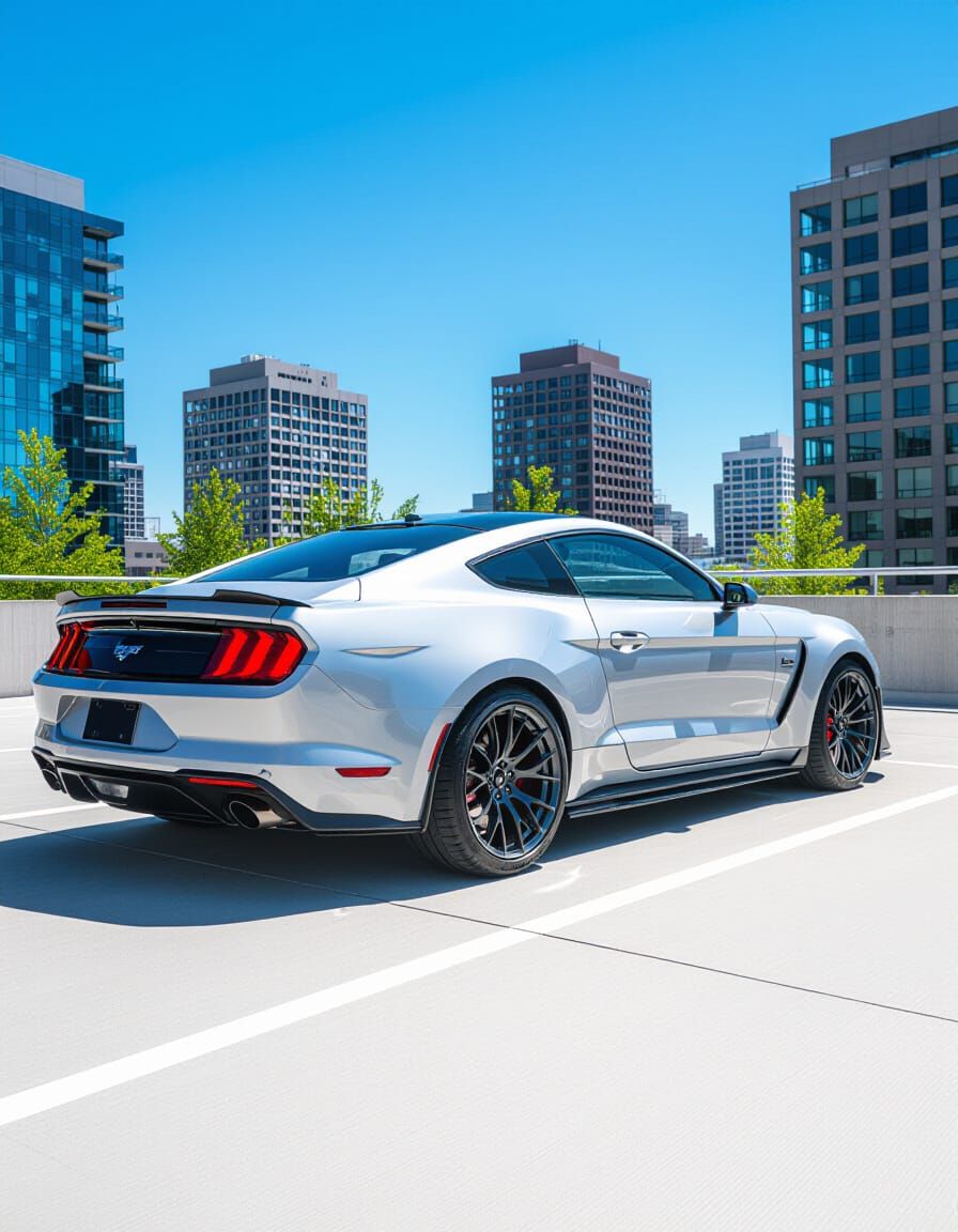 This photorealistic image showcases a modified silver Ford Mustang sports car on a sunny urban parking garage rooftop. Features include sharp lines, metallic paint, and a city backdrop.