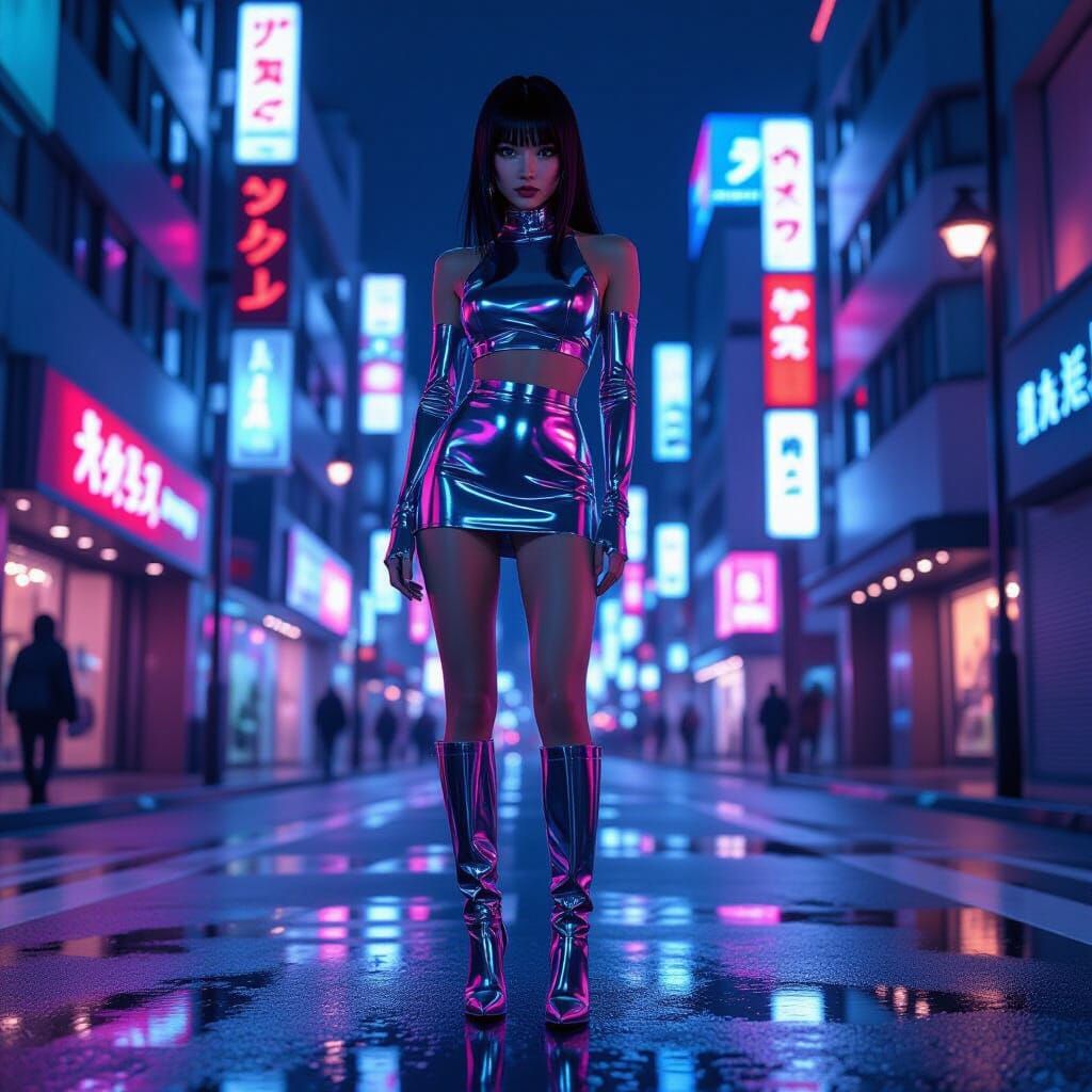 This hyperrealistic image captures a stylized woman in a metallic skirt and heels on a neon-lit Tokyo street. Cinematic lighting highlights wet pavement reflections in electric blues and purples.