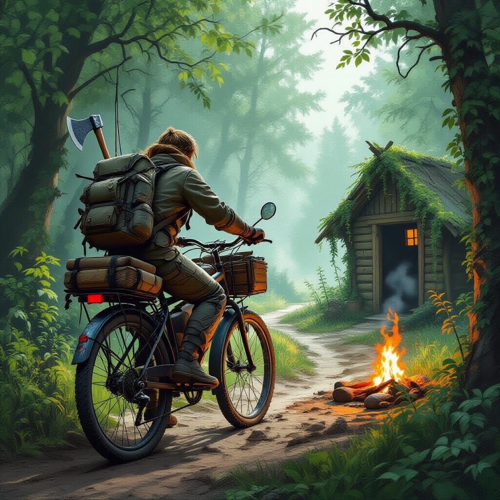 A determined prepper flees a ruined city on a survival-equipped bicycle, heading for a hidden forest shelter. Realistic concept art with dramatic golden hour lighting.