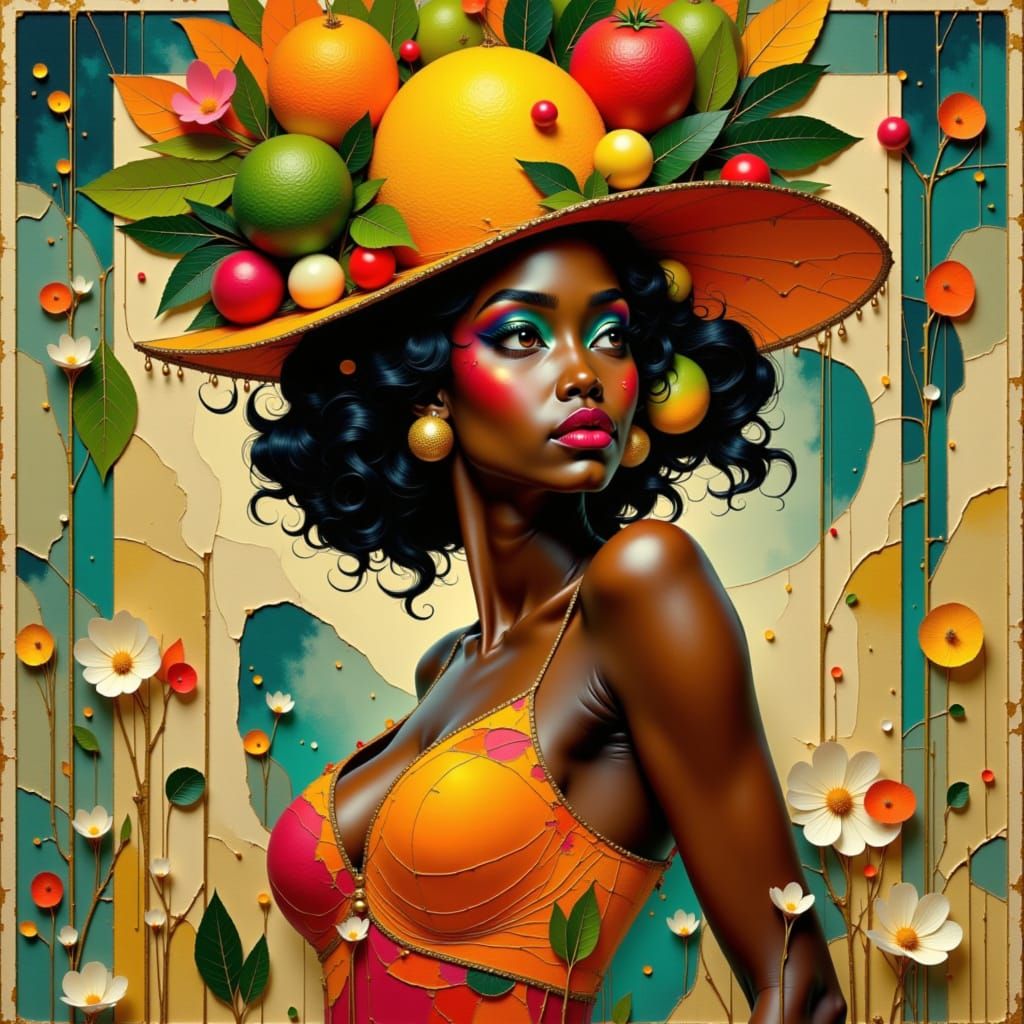 This image shows Josephine Baker in an elaborate fruit hat and costume performing a cabaret dance. The art deco image is rendered in vibrant colors and patterns, in a 1920s style.