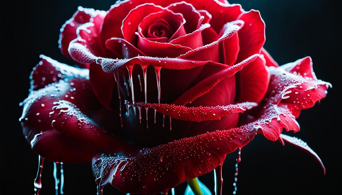 A medium shot of a creepy red rose flower dripping from gums. This hyperrealistic splash art features exaggerated angles, dramatic cinematic lighting, and bioluminescent textures in dark, muted tones.