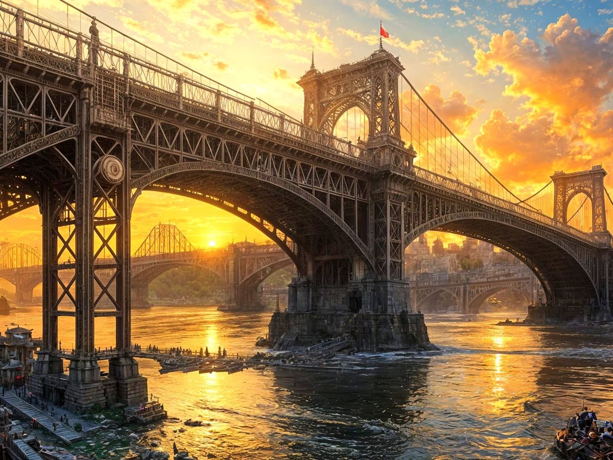 A detailed matte painting showcases an old iron bridge spanning a river, bathed in the warm, golden light of sunset. The image features soft edges and dramatic lighting.