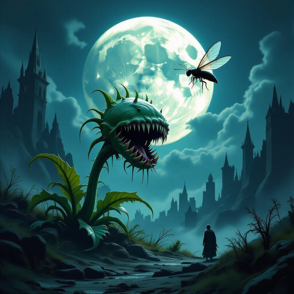 This image shows a menacing alien carnivorous plant capturing a winged insect in a dark, mystical medieval setting. The scene features a huge moon and dramatic, cinematic lighting with deep shadows.