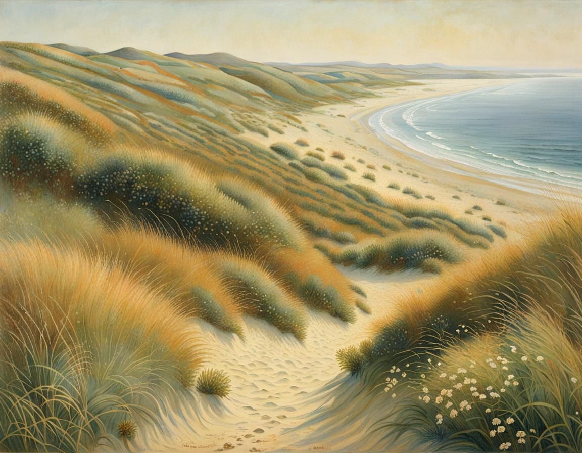 This image presents a serene dune landscape meeting the sea, rendered in a style reminiscent of Impressionist painters with vibrant, textured brushstrokes.