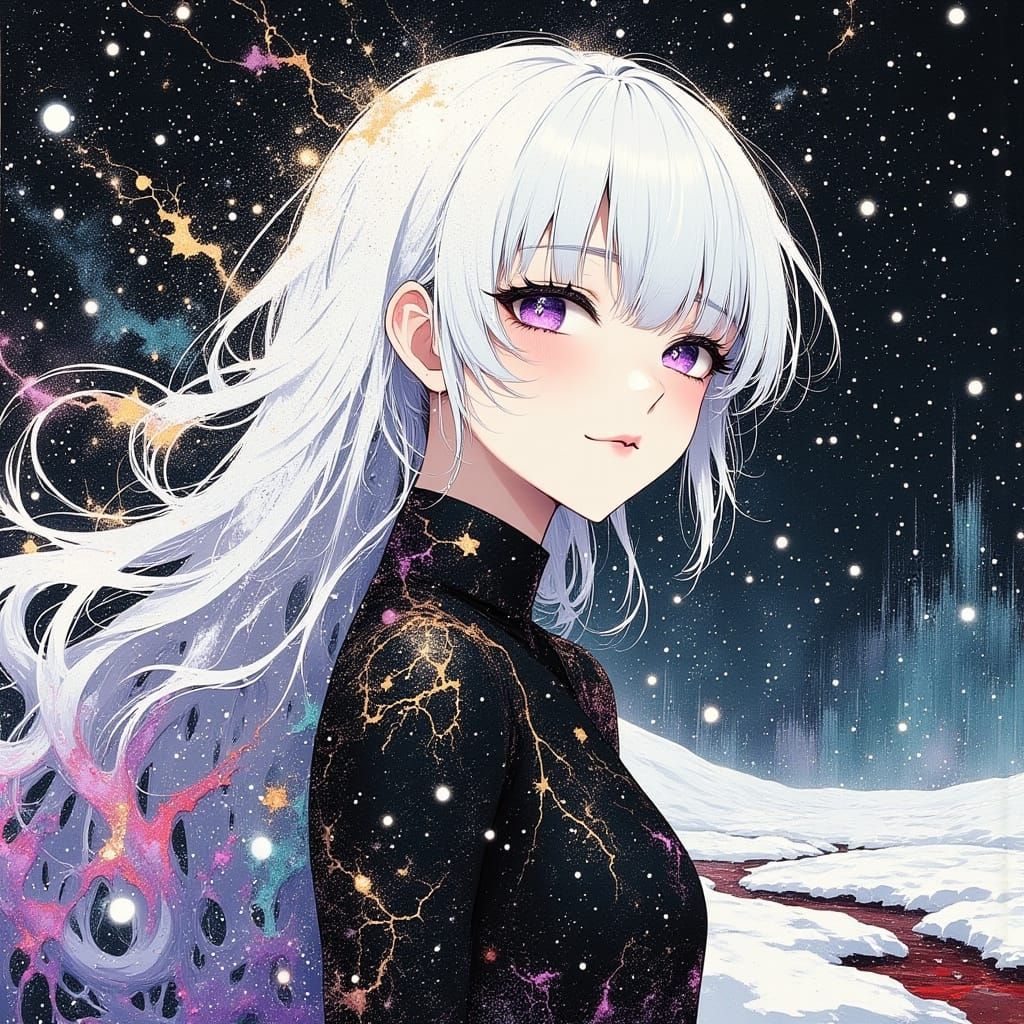 80s anime, beautiful woman, zentangle, fractured, vanta black whaite purple green red blue siver gold contrast, [Verse] Born in the frost wh...