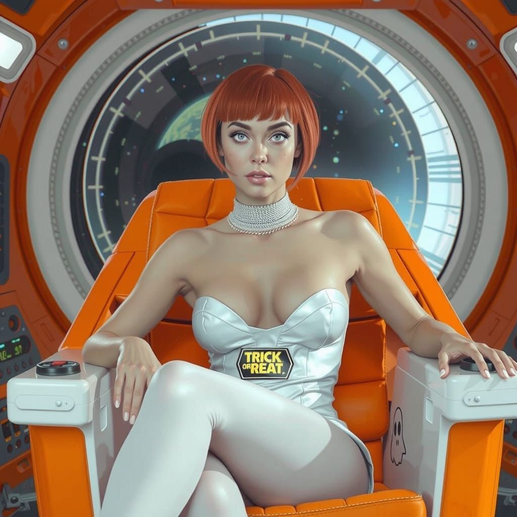 A striking Star Trek officer with a short, sharp-angled bob of reddish-orange hair. She wears a low top, miniskirt, and black hose adorned with Halloween motifs.