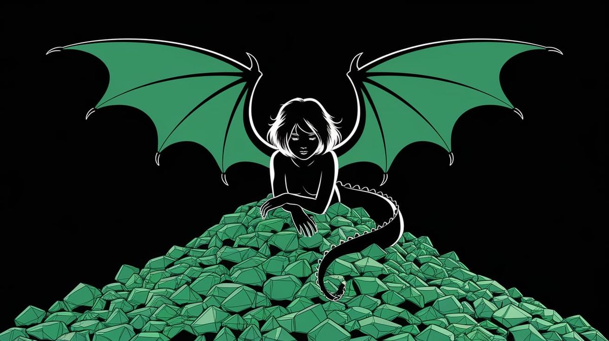 A mysterious girl with dragon wings and tail lies on a pile of emeralds in the dark, depicted in a comic book art style with smooth lines and a predominantly green and black color scheme.