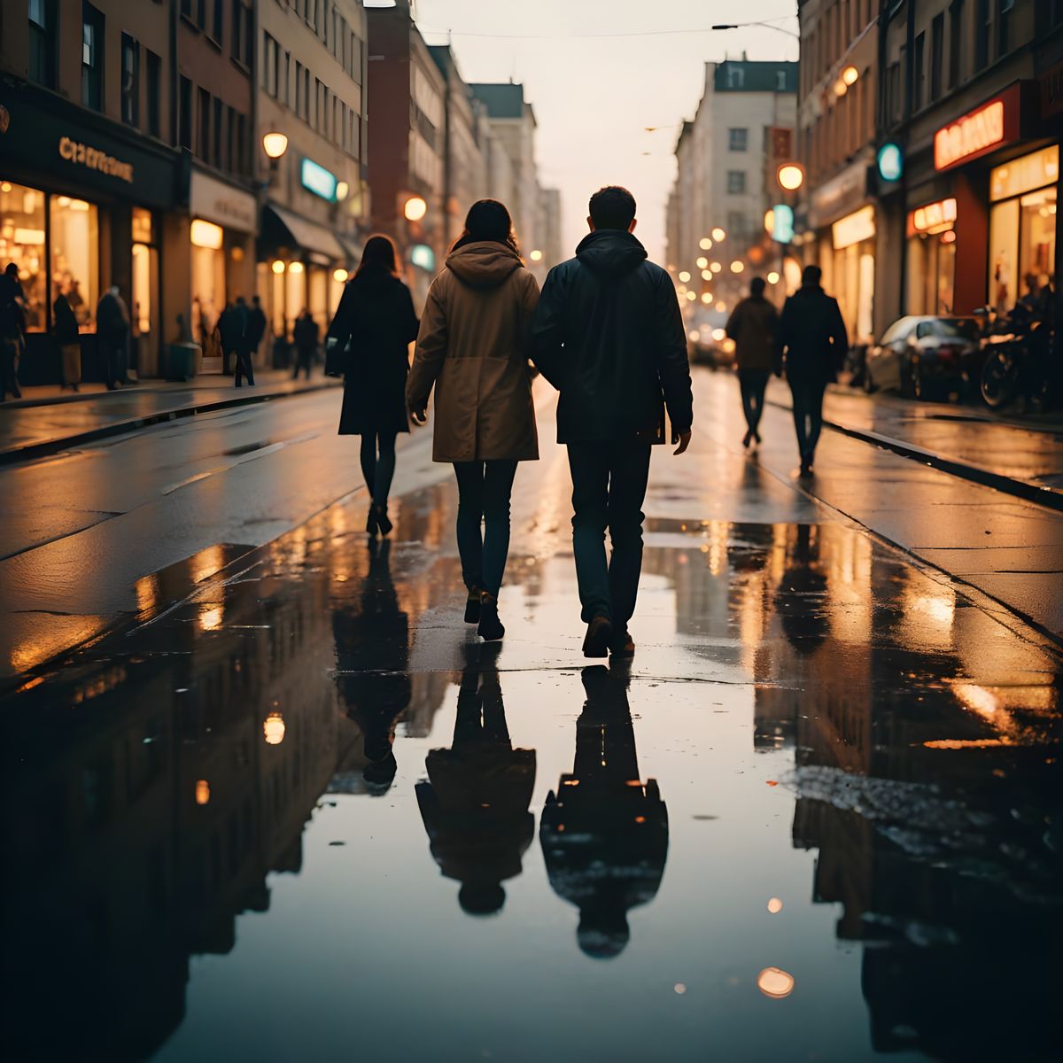 This image captures a nostalgic scene of a busy city street at dusk, with warm tones and soft lighting, reminiscent of a professional photograph taken on film. The wet street reflects the lights of storefronts and street lamps, evoking a sense of memory and impermanence.