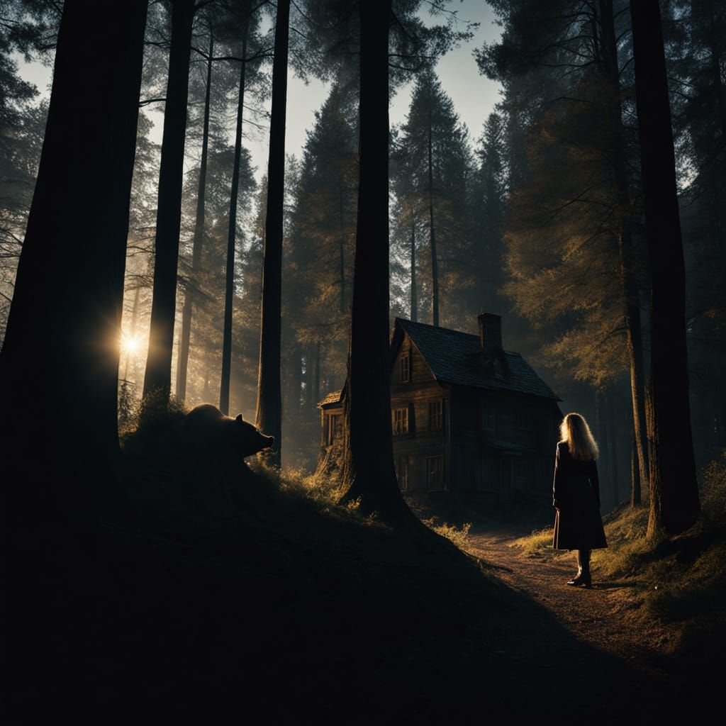 This image shows a blonde girl trespassing in a bear's house. The scene evokes film noir, enhanced by dramatic lighting and high contrast, reminiscent of Hopper and Lang's works.