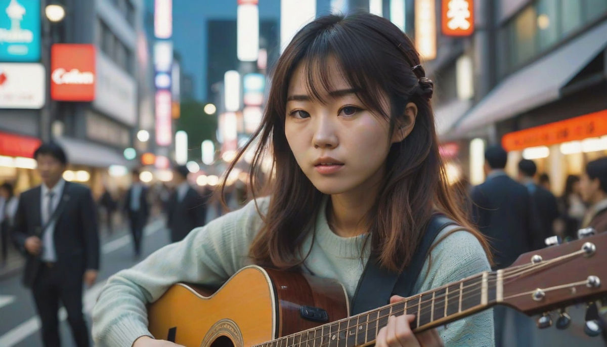 "Japanese teen girl playing acoustic guitar and singing on a street corner in Shinjuku Professional photography, bokeh, natural lighting, canon lens, shot on dslr 64 megapixels sharp focus"