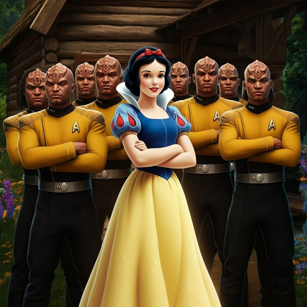 This image shows a beautiful Snow White posing with seven imposing Klingon warriors in a sunny, rustic cabin setting, blending classic Disney charm with futuristic and dynamic character illustration elements.