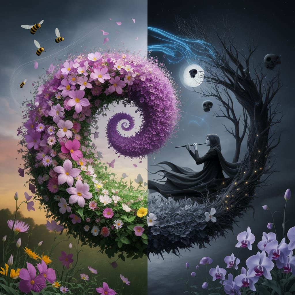 This image shows a digitally rendered garden divided into realms of life and death. One side features colorful wildflowers and vibrant life, while the other displays a moonlit grove with skeletal trees, illustrating a cyclical exchange.